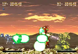 The player can choose one of three Buster Gears, each with its own advantages and disadvantages: the balanced Storm Forgel (piloted by Keith Spader), the speed-focused High Mustang (piloted by Lisa Rowland), and the power-focused Phalanx Smasher (piloted by Dr. Blodin Lloyd).[1][3][6] Each craft can switch between two modes: a compact spaceship fighter and a humanoid mecha armor.[1][4][7] The fighter mode is fast, easily maneuverable, and fires wide shots.[1][3][7] The armor mode is slower, larger, and less responsive, but capable of firing up or down at a 45-degree angle with superior firepower and traveling on terrain.[1][4][6] Both modes are simultaneously upgraded by collecting power-up icons (P) that drop from defeated enemies, however, the game's rank system increases based on the number of power-ups collected.[1][6]