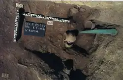 It owes its name (Tomb of the warriors) to the large number of skeletons (more than 200), deposited in 13 chronological strata, and for the rich military kit, dated to c. 1650-1600 BC, which includes swords and daggers of arsenical copper (19 in all). The swords and triangular blades range in length from 27 up to 66 cm and show some similarities to the swords of the El Argar culture (southeastern Spain).[2] The kit is kept at the National Archaeological Museum of Cagliari.