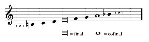 The Hypophrygian (deuterus plagalis) mode, literally meaning "below Phrygian (plagal second)", is a musical mode or diatonic scale in medieval chant theory, the fourth mode of church music. This mode is the plagal counterpart of the authentic third mode, which was called Phrygian. In the Middle Ages and Renaissance this mode was described in two ways: the diatonic scale from B to B an octave above, divided at the mode final E (B–C–D–E + E–F–G–A–B); and as a mode with final E and ambitus from the A below to the C above. The note A above the final (the tenor of the corresponding fourth psalm tone) had an important melodic function.[1] The melodic range of the ecclesiastical Hypophrygian mode therefore goes from the perfect fourth or fifth below the tonic to the perfect fifth or minor sixth above.