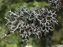 The species has also been found in east-central Mexico,[10] and at elevations of 2,050–3,000 m (6,730–9,840 ft) in Costa Rica, Venezuela and Ecuador.[5] In Asia, it occurs in the Hengduan Mountains of China at elevations of 2,100–2,800 m (6,900–9,200 ft), where it commonly grows on Pinus bark,[13] and at 3,450 m (11,320 ft) in the Baliem Valley of Papua New Guinea.[14] It has also been recorded at 3,900 m (12,800 ft) in Uganda.[5] Populations found outside North America tend to have longer and more linear thallus lobes, more abundant and somewhat longer marginal rhizines, and (in South American specimens) more abundant soralia distributed over the distal parts of the lobes, rather than being confined to the lobe tips as in Appalachian specimens.[5] Molecular phylogenetic analysis confirms that populations from different continents belong to the same evolutionary lineage despite their disjunct distribution.[13][15]