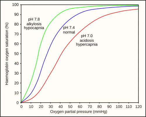 Hyperventilation depletes the blood of carbon dioxide (hypocapnia), which causes respiratory alkylosis (increased pH), and causes a leftward shift in the oxygen–hemoglobin dissociation curve. This results in a lower venous partial pressure of oxygen, which worsens hypoxia.[21] A normally ventilated breath-hold usually breaks (from CO2) with over 90% saturation which is far from hypoxia. Hypoxia produces a respiratory drive but not as strong as the hypercapnic respiratory drive.[12] This has been studied in altitude medicine, where hypoxia occurs without hypercapnia due to the low ambient pressure.[13] The balance between the hypercapnic and hypoxic respiratory drives has genetic variability and can be modified by hypoxic training. These variations imply that predictive risk cannot be reliably estimated, but pre-dive hyperventilation carries definite risks.[6]