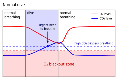 The primary urge to breathe is triggered by rising carbon dioxide (CO2) levels in the bloodstream.[25] Carbon dioxide builds up in the bloodstream when oxygen is metabolized and it needs to be expelled as a waste product. The body detects carbon dioxide levels very accurately and relies on this as the primary trigger to control breathing.[25] Hyperventilation artificially depletes the resting concentration of carbon dioxide causing a low blood carbon dioxide condition called hypocapnia. Hypocapnia reduces the reflexive respiratory drive, allowing the delay of breathing and leaving the diver susceptible to loss of consciousness from hypoxia. For most healthy people, the first sign of low oxygen levels is a greyout or unconsciousness: there is no bodily sensation that warns a diver of an impending blackout.[10]