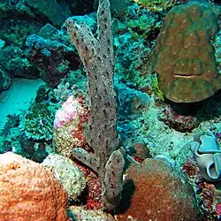 These tropical hermaphroditic sponges can reach a depth range of 0 – 100 m. They are filter-feeders living attached to a substrate at base of pinnacles.[4]