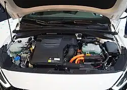 The estimated combined total system output is 139 hp (104 kW) with 195 lb⋅ft (264 N⋅m) torque[21] powered by a 1.6-litre Kappa four cylinder Atkinson-cycle engine with 40% thermal efficiency capable of delivering 104 hp (78 kW) with an estimated torque of 109 lb⋅ft (148 N⋅m) plus the electric motor delivers an additional estimated 43 hp (32 kW) with an estimated maximum torque of 125 lb⋅ft (169 N⋅m) for a maximum 147 hp (110 kW) with 234 lb⋅ft (317 N⋅m) torque. Power is delivered to the front wheels through six speed dual-clutch transmission.[16] Neither the Ioniq Hybrid nor Electric is suitable for towing a trailer, like many hybrids and electrics.[22]
