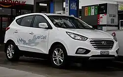 The Tucson Fuel Cell Electric Vehicle (FCEV) is a test fuel cell vehicle for Hyundai's second-generation hydrogen fuel cell. The vehicle includes an 80 kW electric motor by Enova Systems of Torrance, California, UTC Fuel Cells by South Windsor, Connecticut, 152V battery co-developed by Hyundai Motor Co. and LG Chem in Seoul, Korea, 152 litres (33 imp gal; 40 US gal) hydrogen storage tanks developed by Dynetek Industries of Calgary, Alberta, Canada. The vehicle has range of 300 kilometres (186.4 mi) and top speed of 150 km/h (93 mph).[11]