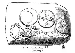 In later periods in Mesopotamian art, for example on decorated boundary stones (kudurru), Išḫara was instead associated with scorpions.[68] While scorpions are present in Mesopotamian art from the Early Dynastic period already, Doris Prechel stresses that even if they served as symbols of a deity, it cannot be assumed that it necessarily was Išḫara.[75] Neither the reason behind the change in her symbolic animal nor the reasons behind the attribution of either of them are known.[70] No depictions of her from the Kassite and Middle Babylonian periods are anthropomorphic, and she came to only be represented in art by her symbol.[76] Incised images of scorpions presumably reflecting this animal's connection with Išḫara have been identified on two late Babylonian legal documents signed by prebendaries linked to her.[77] It has been suggested that scorpions depicted on items which belonged to Assyrian queens might also be connected to the iconography of Išḫara, one example being the seal of Hamâ, the wife of Shalmaneser IV, with a goddess accompanied by a scorpion and either a lion or a dog, though the validity of this assumption is not universally accepted.[78] In Mesopotamian astronomy, Išḫara was associated with mulgir-tab (literally "scorpion star").[58] A description of this constellation, which corresponds to Scorpius, is preserved in the compendium MUL.APIN: