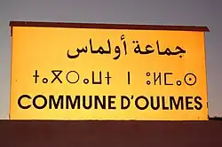 Roadsign in Morocco, showing an iḍāfah construction: جماعة أولماس jamāʿat ʾūlmās "Commune of Oulmes".