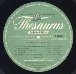 Cy Walter's piano version of "I'll Never Tire of You" was part of the now-defunct NBC Radio Network music. It was recorded on RCA Thesaurus transcription discs for the sole purpose of broadcasting on radio stations. These discs, which were advertised in magazines like Down Beat and others, provided material—from station-identification jingles and commercials to full-length programs—for use by local stations, which were affiliates of one of the radio networks. Efforts were made as early as 1936 to consolidate the RCA Victor transcription service with NBC's independent transcription service within the NBC radio network. NBC's Thesaurus catalog system and library of recordings was not completely merged with RCA's catalog until 1939 when the consolidation was completed in an effort to compete with rival transcription services which were available at the Mutual, Columbia and World Broadcasting Systems.