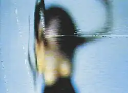 In this early work, Rist presents us with the voyeuristic camera view on the female body according to Elisabeth Bronfen, but at the same time destroys its effect in three ways: dance movements and voice appear distorted, the body is darkened by a color filter and blurred throughout the work. Although the breasts are visible, there is no erotic pleasure. In the few bars of the song that can be heard at normal speed in the end, John Lennon′s voice acts as a counterpoint to the female vocals.[6]