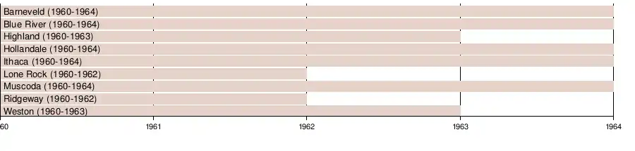 The I-W League, also known by its official name of the Iowa County-Wisconsin River League, was formed in 1960 from the merger of two previously established conferences: the Iowa County League (Barneveld, Highland, Hollandale and Ridgeway) and the Wisconsin River League (Blue River, Ithaca, Lone Rock, Muscoda and Weston).[1] These two conferences were losing members rapidly due to consolidation of rural school districts, and joined forces to continue interscholastic league competition. Ironically, the very same reason this league was created also contributed to its eventual demise. Basketball was the first sport sponsored by the new league, and eight-player football was sponsored for the first time in 1961 with all members participating except for Ridgeway (which did not sponsor football).[2] In 1962, the I-W League lost both Lone Rock and Ridgeway to consolidation.[3] Lone Rock merged with Arena and Spring Green to create the River Valley district,[4] and Ridgeway was folded into Dodgeville's school district. Additionally, three football members joined from the Kickapoo Valley League that fall: Gays Mills, La Farge and Seneca[5] Their time as football-only members was short-lived, as all three schools returned to the Kickapoo Valley League for the 1963 season.[6] The I-W League also lost two more members in 1963, as Highland and Weston left to join the Black Hawk League[7] and Scenic Central Conference,[8] respectively. Left with only five members, the conference continued for one more season before Muscoda left to join the Southwest Wisconsin Athletic League in 1964.[9] The I-W League ended operations in later that year when two of its members (Blue River and Ithaca) joined the Kickapoo Valley League.[10] The two remaining schools (Barneveld and Hollandale) competed as independents for a season before following their I-W League brethren into the Kickapoo Valley League for 1965.[11]