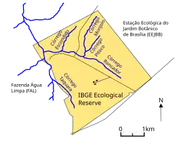 The IBGE Ecological Reserve covers 1,300 hectares (3,200 acres) and is 25 kilometres (16 mi) south of Brasilia. It is bounded by the University of Brasília's 4,500 hectares (11,000 acres) experimental farm Fazenda Água Limpa (FAL) to the west and the 5,000 hectares (12,000 acres) Estação Ecológica do Jardim Botânico de Brasília (EEJBB) to the north and east.[2] These form the Environmental Protection Area of the Gama-Cabeça de Veado District, with 10,000 hectares (25,000 acres) of contiguous protected area.[3] The reserve is a very representative zone of central Brazil, with all the typical aspects of the cerrado.[4]