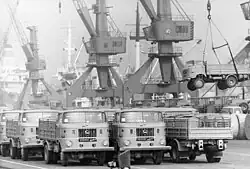 A high proportion of IWL trucks was exported. Between 1978 and 1987 over 80% of W 50 trucks built each year were sold abroad.[1] The DDR needed export orders from countries outside the Comecon bloc, and for this IWL continued to develop variants of the W 50.[9] As a result of the 1980–88 Iran–Iraq War, both Iran and Iraq sought a simple, robust, inexpensive truck for their armies.[9] The DDR was interested in supplying both sides in the war, so in March 1982 IWL began development of two derivative models, the IFA W 51 and W 52.[9] The W 51 was meant to enter production in 1983, followed by the W 52 two years later.[9] Part of the W 51 project was realised, but the W 52 was overtaken by an SED Politbüro decision in June 1983 to instruct IWL to concentrate on W 50 assembly and gradually displace it with its intended next-generation successor, the L 60.[9] Total W 50 production at Ludwigsfelde from 1965 to 1990 was 571,831 vehicles,[10] some sources state 571,789.[3]