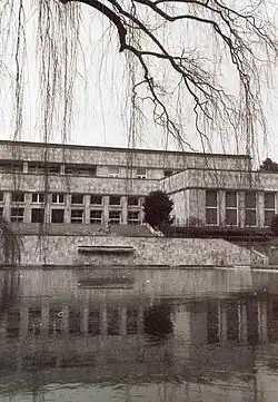 Behind the rotunda is an oblong pool with a Nymphenskulptur (German:Nymph sculpture) at the water's edge created by Fritz Klimsch entitled "Am Wasser". Behind it stands a flat building on a hill with a terrace—the casino of IG Farben and the Officers Club of the US Army ("The Terrace Club"), which now houses a refectory and lecture-rooms.[1]