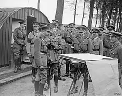 On mobilisation in August 1914 it was decided that the BEF would have two-division army corps like the French armies with which the BEF was to operate but only one corps HQ existed, two were improvised.[9] II Corps proceeded to France in August 1914 under the command of Sir James Grierson but Grierson died suddenly on the train to the front on 17 August. Sir John French (GOCinC BEF) wanted Sir Herbert Plumer to succeed Grierson, but the secretary of state for war, Earl Kitchener, instead chose Sir Horace Smith-Dorrien, transferred from Southern Command. Smith-Dorrien caught up with his HQ at Bavai on 21 August.[10] II Corps was first engaged two days later at the Battle of Mons and forced into the Great Retreat with the rest of the BEF. It later fought a delaying action against Alexander von Kluck's German First Army in the Battle of Le Cateau which allowed most of its surviving forces to escape.[11] It remained on the Western Front throughout the war. It was forced into retreat, with the soldiers exhaust