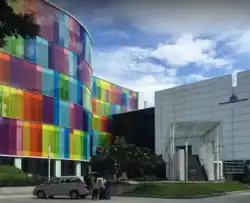 Consisting of 11,000 square meters, this unique building is the first of its kind to be built in India with its colored façade and unmistakable identity.[57] Designed by architect Abin Chaudhuri, the concept was to insert a burst of color in the city's monotonous dense urban fabric, representing the colors of the sky. To achieve the colors in the glass facade, Vanceva PBB has been used as the sandwich material between two layers of glass.[58] The colored laminate on the façade follows no repetitive pattern and is symbolic of the unpredictable nature of the sky. It also represents the vibrancy of today's youth. An integrated plaza with a water body has been designed. The water body receives no direct sunlight and creates a comfortable micro-climate. Wherever possible shading trees have been planted on the hard landscape and soft landscape has been introduced.[59]