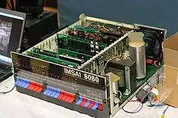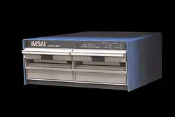 The IMSAI 8080 is an early microcomputer released in late 1975, based on the Intel 8080 (and later 8085) and S-100 bus.[1] It is a clone of its main competitor, the earlier MITS Altair 8800. The IMSAI is largely regarded as the first "clone" microcomputer. The IMSAI machine runs a highly modified version of the CP/M operating system called IMDOS. It was developed, manufactured and sold by IMS Associates, Inc. (later renamed to IMSAI Manufacturing Corp). In total, between 17,000 and 20,000 units were produced from 1975 to 1978.