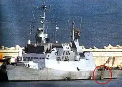 During the 2006 Lebanon War, the vessel was patrolling in Lebanese waters ten nautical miles off the coast of Beirut. It was damaged on 14 July 2006 on the waterline, under the aft superstructure[2][3] by a missile (likely a Chinese-designed C-802[4]) fired by Hezbollah that reportedly set the flight deck on fire and crippled the propulsion systems inside the hull.[5] However, INS Hanit stayed afloat, withdrew and made the rest of the journey back to Ashdod port for repairs under its own power.[6] Four crew members were killed during the attack: Staff Sergeant Tal Amgar, Corporal Shai Atas, Sergeant Yaniv Hershkovitz, and First Sergeant Dov Steinshuss.[7]
