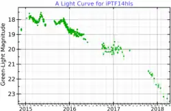 iPTF14hls was an ongoing event into 2018, when after about 1,000 days, its light displayed a dramatic drop, but the event remained visible,[3] and by November 2018 its spectra had become a remnant nebula.[3] A high-resolution image of this latest phase was obtained with the Hubble Space Telescope during Cycle 25 (October 1, 2017, to September 30, 2018).[3]