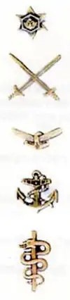 Award of the decoration for service in active military operations is indicated by distinguishing insignia which indicate the arm of the service in which the recipient was serving at the time of the action for which the decoration was conferred. The insignia are struck in bronze and is worn on the ribbon above any bars which may have been awarded.