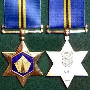 The reverse bears, in relief, the coat of arms of South Africa. The decoration is attached to a plain silver-gilt suspender, affixed to the upper point of the star. The medal number is stamped or engraved below the coat of arms.[1]