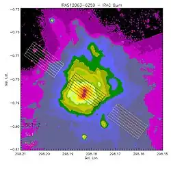 IRAS 12063−6259 is a compact H II region in the constellation of Crux. It lies at a heliocentric distance of roughly 9.5 kpc and a galactocentric distance of 9.3 kpc.[1] Although previously classified as a planetary nebula as well as an H II region, this source is now solely classified as a normal compact H II region, due to its colour criteria,[2] its infrared luminosity, and its spectral content.[3]