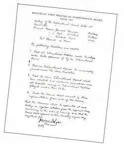 On 5 December 1887, committee members of the Irish Rugby Football Union, Scottish Rugby Union (named the Scottish Football Union at the time) and Welsh Rugby Union met in Manchester and wrote up the first four principles of the International Rugby Football Board. England refused to take part in the founding of the IRFB, stating that they should have greater representation, as they had more clubs.[12] The England Union also refused to accept the IRFB as the recognised lawmaker of the game.[12] This led to the IRFB taking the stance of member countries not playing England until they joined, and no games were played against England in 1888 and 1889.[13] In 1890 England joined the IRFB, gaining six seats while the other unions had two each.[13] The same year, the IRFB wrote the first international laws of rugby union.[14]