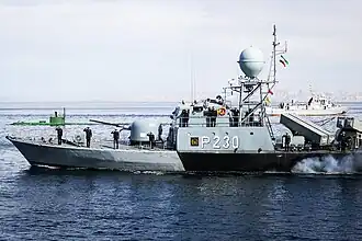 In 2014, Khanjar and Neyzeh (P231) participated in a joint naval drill with Pakistan Navy in the Gulf of Oman.[5] On 7 September 2016, she was dispatched –as part of the 43rd flotilla, along with her sister Falakhon (P226), amphibious vessel Lavan (514) and support ship Konarak (1403)– to secure international waters sailed by Iranian commercial ships,[6] and on 28 September, she arrived in Karachi, Pakistan for a three-day port visit.[7] She made another call to the same port on 10 October 2018, this time with Neyzeh (P231) and Bushehr (422),[8] while deployed for an anti-piracy mission to the Arabian Sea and Gulf of Aden.[5] The ship was modernized in 2017–2021.[9]