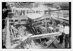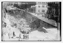 On September 22, 1915, there was an explosion during construction of the 23rd Street subway station that caused the tunnel to collapse. Seven people were killed after a blast of dynamite in the subway tunnel destroyed the plank roadway over Seventh Avenue. As a result, a crowded trolley car, and a brewery truck fell into the excavation, accounting for most of the injuries.[50]