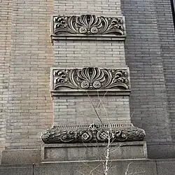 The most elaborately designed section of the building's facade is the eastern elevation facing Eleventh Avenue, which consists of eight bays. The six center bays project slightly and are flanked by brick and terracotta pilasters. Within these six bays, the tops of the arched openings contain transom panels made of glass. There are palmettes placed at regular intervals along the pilasters.[5] The pilasters correspond exactly to the original chimneys.[19] The northernmost bay, the furthest right along the Eleventh Avenue facade, contains the original main entrance, a rectangular doorway with a classically designed frame.[5][28][29] The fourth-story attic contains pairs of rectangular windows in each bay, surrounded by ornamented window frames.[26][27] A parapet, containing a tablet with the words interborough rapid transit company, runs above the center of the attic. Between the facade and the sidewalk is a planting bed surrounded by an iron railing; the space originally contained a sunken basement court.[26]