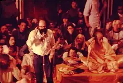 Hundreds of persons jammed into the theater and clusters of other hopefuls paced expectantly outside the auditorium doors...Others found a way onto the stage and lifted the curtains to find themselves standing five feet from Ginsberg and the holy man..."Hare Krishna, Hare Krishna, Krishna Krishna, Hare Hare, Hare Rama, Hare Rama, Rama Rama, Hare Hare," chanted the students, over and over again, clapping and dancing to the rhythmic drone of the Indian incantation.[5]