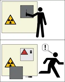 ISO 21482 is a technical standard that specifies the design and usage of a "supplemental radiation warning symbol", a warning symbol. It is intended to warn people of the dangers of radiation hazards posed by sealed sources, and encourage the viewer to get away from the source. The symbol's design was the result of a joint project between the International Atomic Energy Agency (IAEA) and International Organization for Standardization (ISO) in the early 2000s.[1]