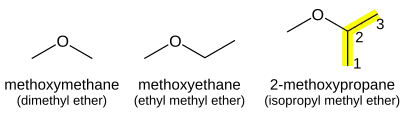 Ethers (R−O−R) consist of an oxygen atom between the two attached carbon chains. The shorter of the two chains becomes the first part of the name with the -ane suffix changed to -oxy, and the longer alkane chain becomes the suffix of the name of the ether. Thus, CH3OCH3 is methoxymethane, and CH3OCH2CH3 is methoxyethane (not ethoxymethane). If the oxygen is not attached to the end of the main alkane chain, then the whole shorter alkyl-plus-ether group is treated as a side-chain and prefixed with its bonding position on the main chain. Thus CH3OCH(CH3)2 is 2-methoxypropane.