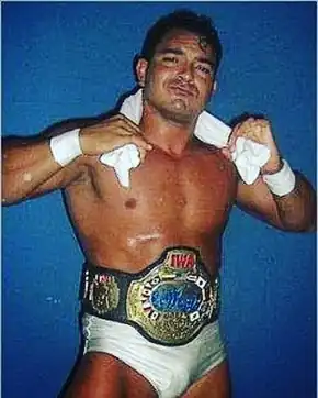 ![]() Joe Bravo with the original IWA World Heavyweight Championship | |||||||||||||