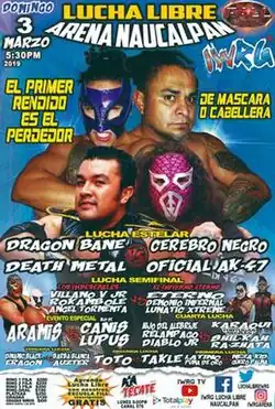 The main event of the March 2019 Máscara vs. Cabellera event Drágon Bane and Death Metal put their masks on the line while Cerebro Negro and Oficial AK-47 put their hair on the line. Because Drágon Bane pinned Oficial AK-47, AK-47 was forced to have all his hair shaved off as a result of the loss, The show included six additional matches,