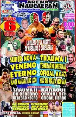 In the first round Trauma I defeated Veneno, Eterno defeated Temerario Infernal and Hijo de Máscara Año 2000 defeated Hijo de Pirata Morgan by using a small steel chain on him, cheating his way to victory.[1][9] In the final first round match Súper Nova dove out of the ring and hit Oficial AK-47 as he was making his way to the ring, a further flying move missed and instead Súper Nova struck the guardrail with his shoulder. Moments later Oficial AK-47 threw the referee into the crowd, drawing a disqualification. Súper Nova was taken to the back on a stretcher to have his shoulder examined.[1][9] As a result, the four winners were out of the tournament, keeping their mask or hair safe. In the second round Veneno defeated Temerario Infernal to get out of the tournament. Oficial AK-47 has his tag team partner Oficial 911 at ringside for his match with El Hijo de Pirarata Morgan, with Oficial 911 trying to distract the referee throughout the match. In the closing moments of the match Oficial AK-47 used a piledriver move on El Hijo de Pirata Morgan, the same way Hijo de Pirata Morgan had done in the battle royal. In this case the referee saw the illegal move being used and disqualified Oficial AK-47, sending him to the finals of the tournament as a result.[1][9]