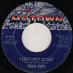 Written and produced by Motown's main production team Holland–Dozier–Holland, "I Can't Help Myself" is one of the most well-known Motown recordings of the 1960s and among the decade's biggest hits. The single topped the Billboard's R&B chart for nine weeks (being named the biggest R&B single of the year by Billboard) and also peaked at No. 1 on the Hot 100 for two non-consecutive weeks,[1] from June 12 to June 19 and from June 26 to July 3 in 1965. It replaced "Back in My Arms Again" by label mates the Supremes. It was first unseated at No. 1 by "Mr. Tambourine Man" by the Byrds, then regained the top spot before being replaced by the Rolling Stones' "(I Can't Get No) Satisfaction". Billboard ranked the record as the second biggest single of 1965. "I Can't Help Myself" was the Four Tops' first top 40 single in the UK, peaking at No. 23 at the end of 1965, then reaching No. 10 in its early 1970 re-release.[2]