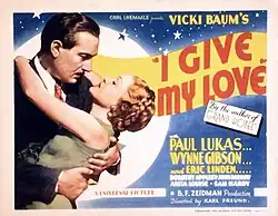 I Give My Love is a 1934 American drama film directed by Karl Freund and written by Doris Anderson and Milton Krims. The film stars Paul Lukas, Wynne Gibson, Eric Linden, Anita Louise, John Darrow and Dorothy Appleby. The film was released on July 17, 1934, by Universal Pictures.[1][2][3]
