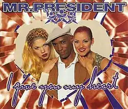 "I Give You My Heart" is a song by German Eurodance group Mr. President, released in July 1996 by Warner Bros. as the second single from their second album, We See the Same Sun (1996). It is written by group member Delroy Rennalls with Rainer Gaffrey, who produced it with Kai Matthiesen. It was also the group's seventh released single and the follow-up to their highly successful "Coco Jamboo". "I Give You My Heart" was a top-10 hit in the Czech Republic, Finland, Germany, Hungary and Switzerland. It was certified gold in Germany and the accompanying music video featured the group performing the song in a movie theater in Vienna.