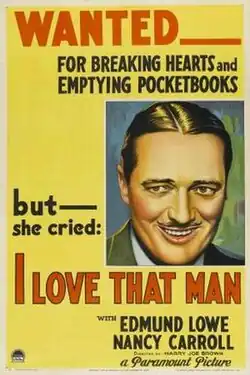 I Love That Man is a 1933 American pre-Code drama film directed by Harry Joe Brown and written by C. Graham Baker, Casey Robinson and Gene Towne. The film stars Edmund Lowe, Nancy Carroll, Robert Armstrong, Lew Cody, Warren Hymer, Grant Mitchell and Dorothy Burgess. The film was released on June 9, 1933, by Paramount Pictures.[1][2]