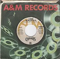 The song entered the Billboard Hot 100 on June 12 at number 55,[4] and peaked at number 25.[5] It peaked at number 36 on the UK charts.[6] In 1995, it was released as a CD single in Japan, after being chosen for the theme song of the drama Miseinen. It was taken from the best-selling compilation 22 Hits of the Carpenters (promoted as a double A-side with "Top of the World"). On his website, Richard Carpenter wrote that "It became one of the biggest sellers of 1995, ultimately going quadruple platinum. In more ways than one, Karen would have loved that!"[2] "I Need to Be in Love" was also the Carpenters' fourteenth number one on the Easy Listening chart.[7]