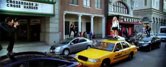 Spears standing atop a yellow taxi. A marquee beside her reads Crossroads 2: Cross Harder, referencing her film debut Crossroads.[49]