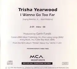 "I Wanna Go Too Far" is a song written by Kent Robbins and Layng Martine Jr., and recorded by American country music artist Trisha Yearwood. It was released in July 1995 as the fourth single from the album Thinkin' About You. The song reached number 9 on the US Billboard Hot Country Singles & Tracks chart.[1]
