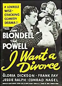 I Want a Divorce is a 1940 Paramount film directed by Ralph Murphy. The screenplay was written by Frank Butler (based on a story by Adela Rogers St. Johns). The film starred then-married actors Joan Blondell and Dick Powell, who would later divorce in real life. Co-star Gloria Dickson and director Murphy were also later married to one another and divorced.