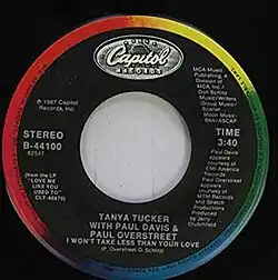 "I Won't Take Less Than Your Love" is a song written by Paul Overstreet and Don Schlitz, and recorded by American country music artist Tanya Tucker with Paul Davis & Overstreet. It was released in October 1987 as the second single from the album Love Me Like You Used To. The single reached number one for the week of February 27, 1988, and spent fifteen weeks on the country chart.[1]