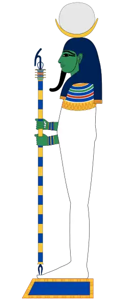 Iah was sometimes considered an adult form of Khonsu and was increasingly absorbed by him. He continued to appear in amulets and occasional other representations, similar to Khonsu in appearance, with the same lunar symbols on his head and occasionally the same tight garments. He differed in usually wearing a full wig instead of a child's sidelock, and sometimes the Atef topped by another symbol.[4] As time went on, Iah also became Iah-Djehuty, meaning "god of the new moon".[5] In this role, he assumed the lunar aspect of Thoth (also known as Djehuty), who was the god of knowledge, writing and calculation. The segments of the moon were also used as fractional symbols in writing.[6]