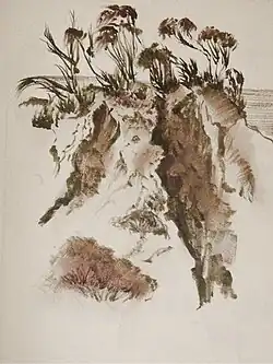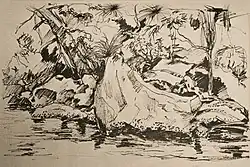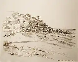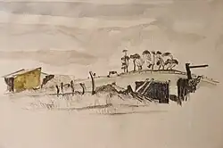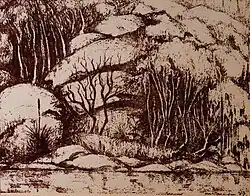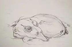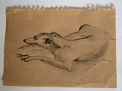 By 1981 Mungeribar was too onerous and too cold for Sprague's health. He sold the Upper Beaconsfield estate and moved to a house and studio he had bought at Mooney Mooney on the Hawkesbury River. Mungeribar was consumed by a firestorm on Ash Wednesday 1983.[39] Sprague made pots and sculptures in a small pottery as well as works on paper.[14] These include lithographs and monoprints. There are many drawings of the river, boats, the rocky escarpments. Other drawings are of his whippet Sprint.[40] In 1992 he moved to a smaller house and studio at Sunshine Beach north of Noosa, Queensland. He died there two years later.[14]
