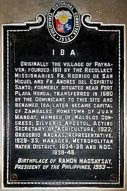 Iba was founded by the Order of Augustinian Recollect priests led by Rodrigo de San Miguel in 1611 as the village of Paynauen.[7] The early inhabitants of the town are called Zambals. They were later joined by the Tagalogs and Ilocanos who migrated to the town, which resulted in the intermingling of customs and traditions.[8] The Aeta people settled in the hinterlands and the majority of them dwelled in the Mount Pinatubo area. In 1860, the administration of the town was turned over to the Dominican priests until the civil government came to power. There are no available records as to when Paynauen was renamed Iba.[7]