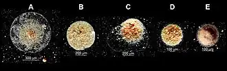 These microspherulites are mostly spherical in shape (roundness index=0.95), with 60-90 μm modal diameter, although some particles can be up to 200 μm in diameter.[3] According to this roundness index, these microspherules are really elongated spheroids with two axes defined along a polar plane and typically presenting a depression or vortex. The presence of plant filaments in the atmosphere can distort these shapes and sizes. In any case, these are uncommon “giant” aerosol particles.