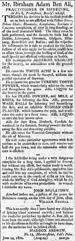 - ^ "Mr. Ibraham Adam Ben Ali". Federal Gazette and Baltimore Daily Advertiser. Baltimore. 29 August 1800. p. 3.