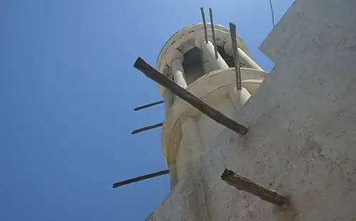 Outside the majlis, a verandah runs along the length of the building, with four serrated archways and columns to its exterior. As well as teak beams, mangrove poles supported the roof, with woven barasti, palm fronds, packing the ceiling space. The building itself is of gypsum and coral, the latter keeping the walls porous and breathable, while wind scoops in the walls helped to ventilate the space. The courtyard of the majlis was shaded by a large tree that the family would sleep around in the hot summer months.[8] The house was abandoned in the 1970s until it was renovated and opened to the public as a museum in 1996,[9] prior to the construction of the Al Bait Hotel, which incorporates the Bait Al Midfa and three other merchants' houses into its structure. Two of Al Midfa's brothers' houses also form part of the hotel building - Bait Eissa Al Midfa forms the hotel reception and Bait Abdul Rahman Al Midfa has become the Heritage guestroom block.[10]
